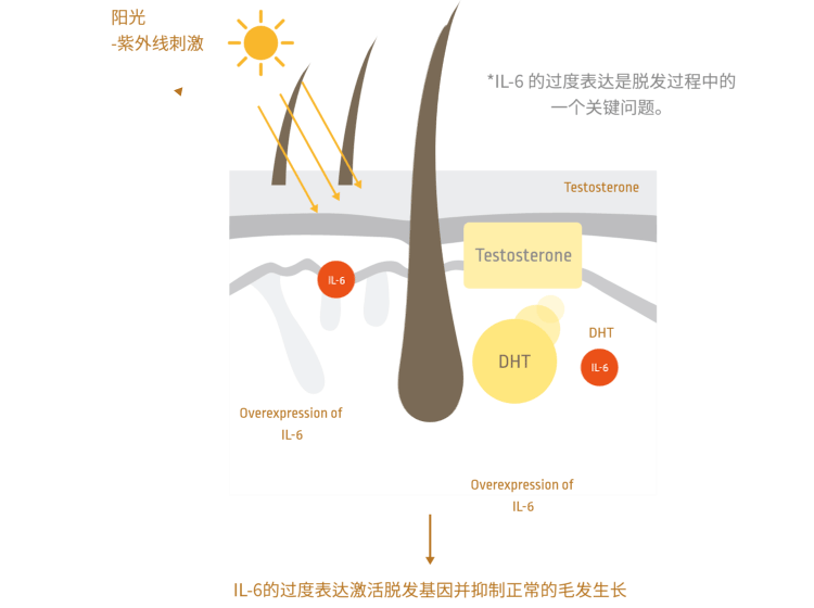 抑制IL-6, TNF-α, IL-8等促炎因子的合成,预防脱发。